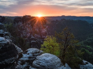 trees, Almsee Lake, Sunrise, Mountains, winter, viewes, Austria