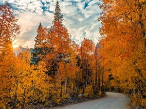 trees, Field, Sunrise, clouds, viewes, Path