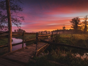 trees, Sunrise, Fog, Pond - car, morning, viewes, ducks