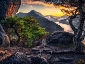 lupine, Meadow, viewes, Fog, trees, Flowers