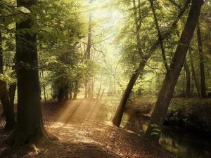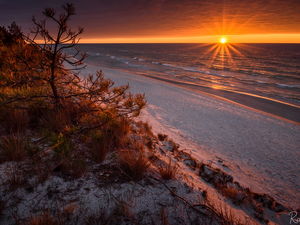 Sunrise, Mountains, pine, Fog, rocks, lake