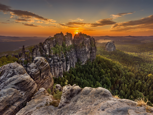rocks, forest, cascade, mossy, waterfall