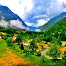 summer, River, Houses, Forest Meadow