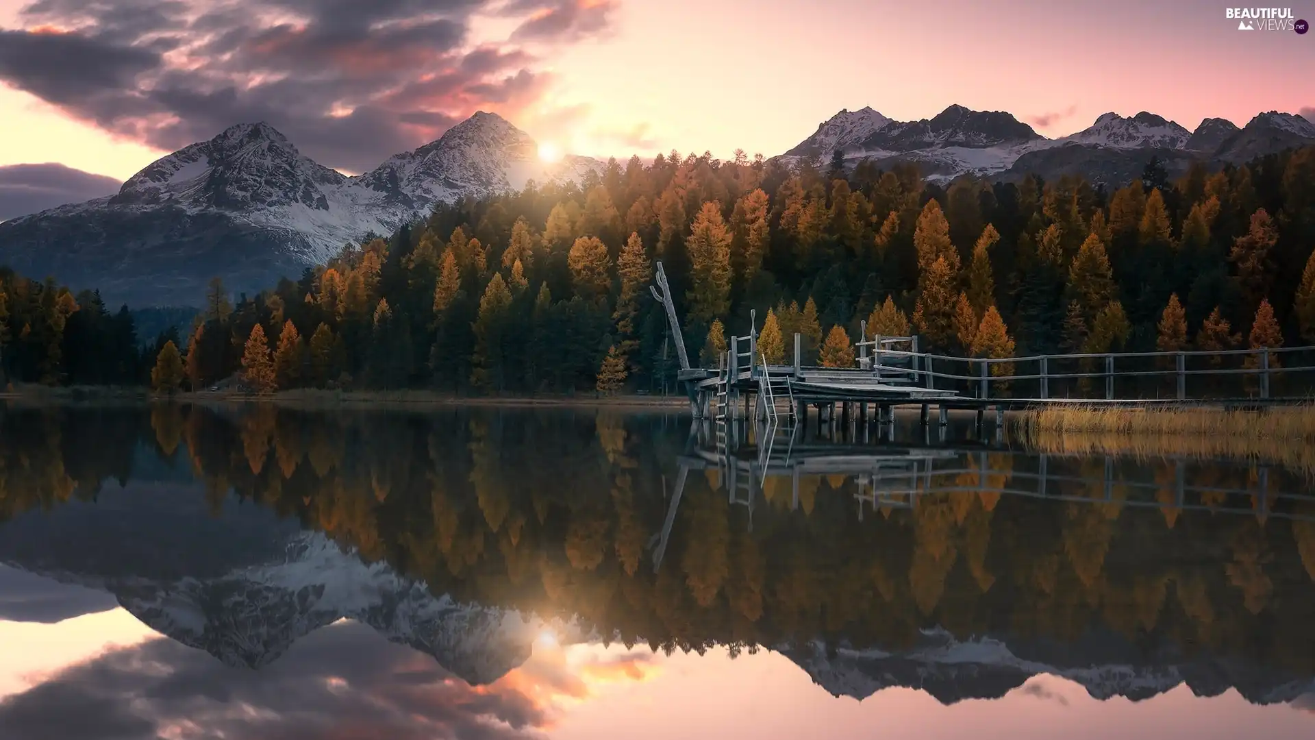 lake, Mountains, Platform, trees, clouds, Switzerland, forest, Great Sunsets, viewes