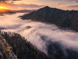 light breaking through sky, Mountains, viewes, pine, trees, rocks