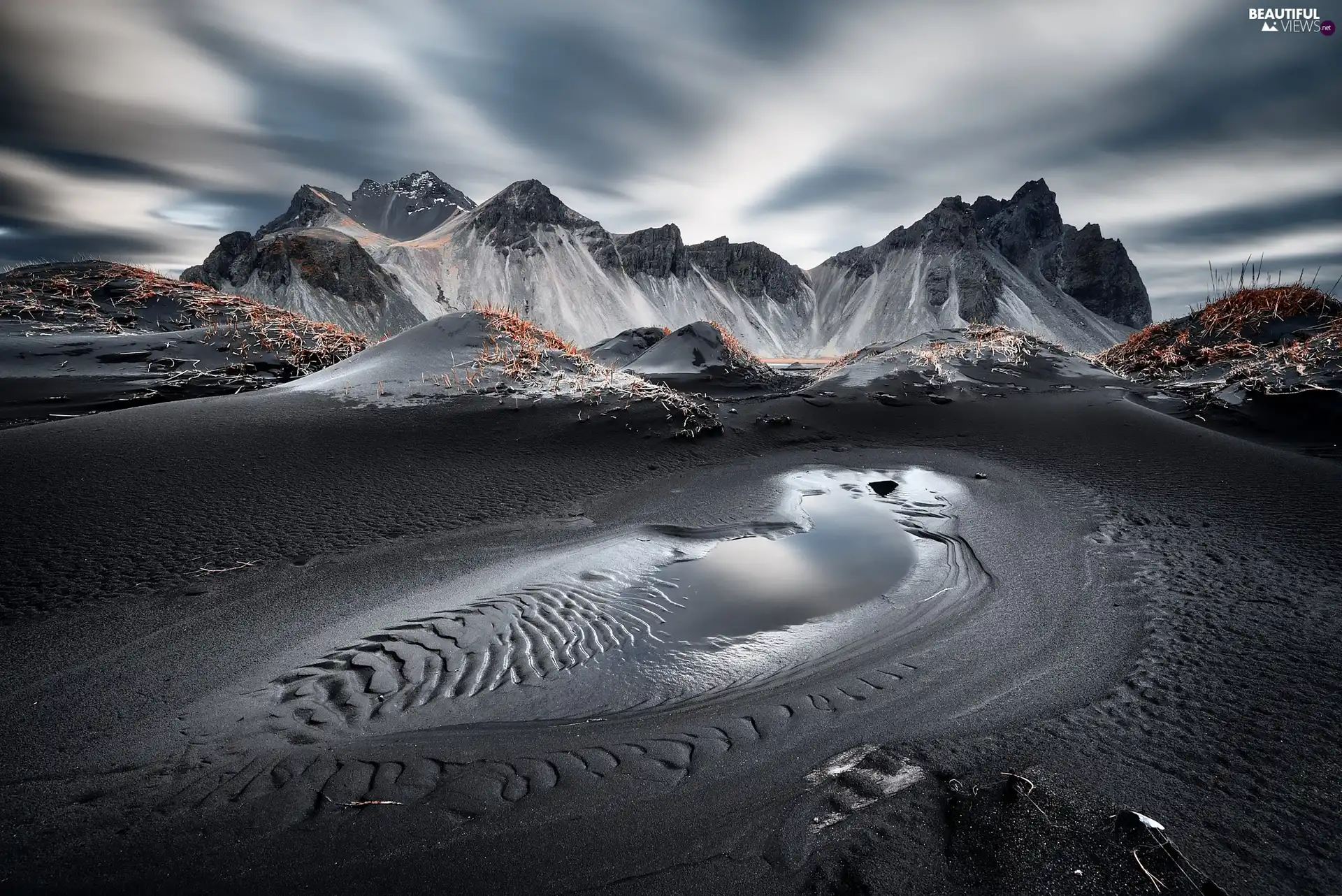 Stokksnes Beach, Vestrahorn mountain, dark, Sand, iceland, Mountains