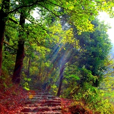 Plants, trees, light breaking through sky, Fog, White frost, viewes