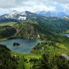 snow, lake, winter, clouds, Sunrise, rocks, Mountains, Sky