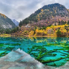 Stones, trees, Mountains, coast, lake, forest, viewes, fence, clear, reflection