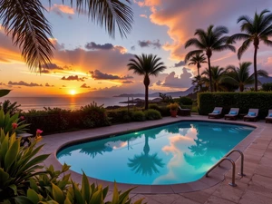 Pool, sea, Flowers, Palms, deck chair, Great Sunsets