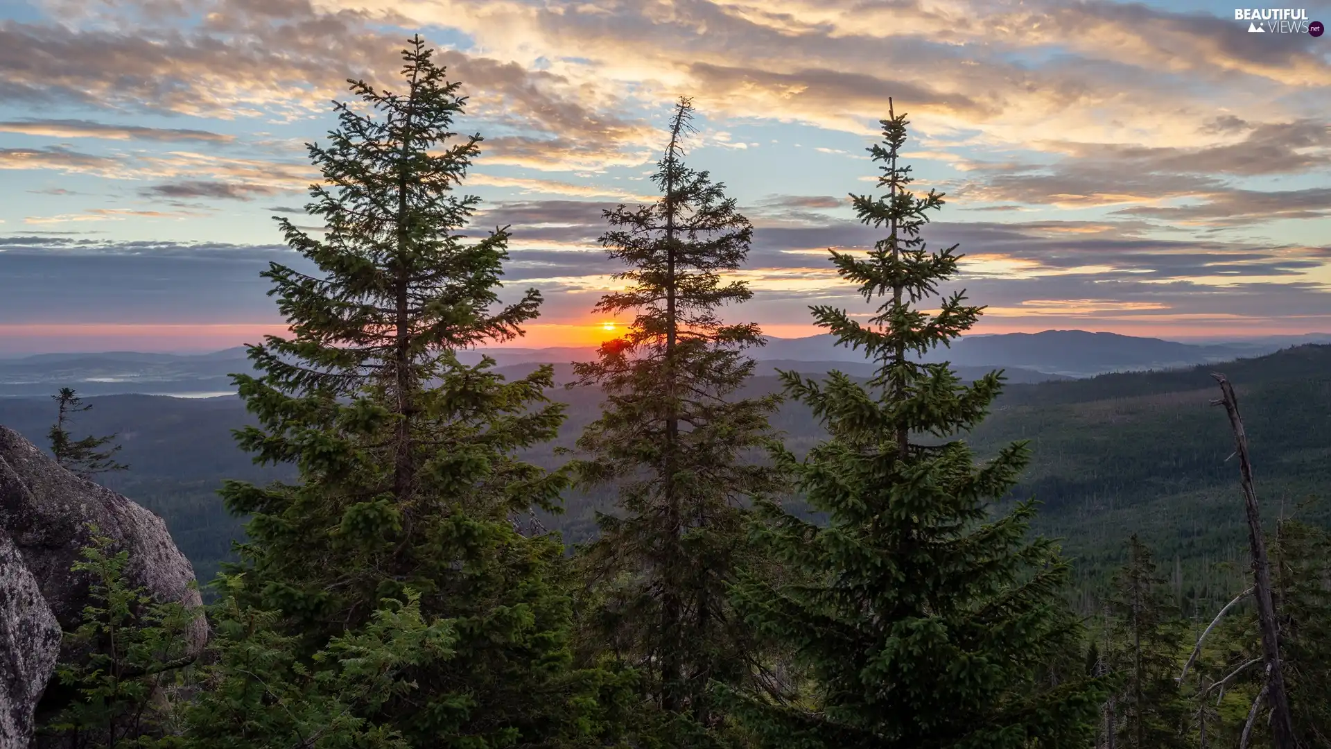 trees, viewes, clouds, Spruces, Great Sunsets, woods, Mountains, rocks