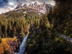 Houses, trees, snow, viewes, Mountains, winter, Sunrise